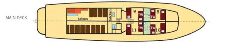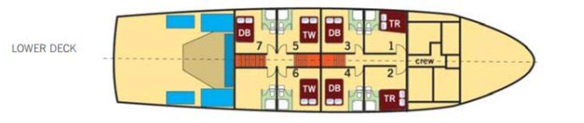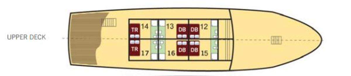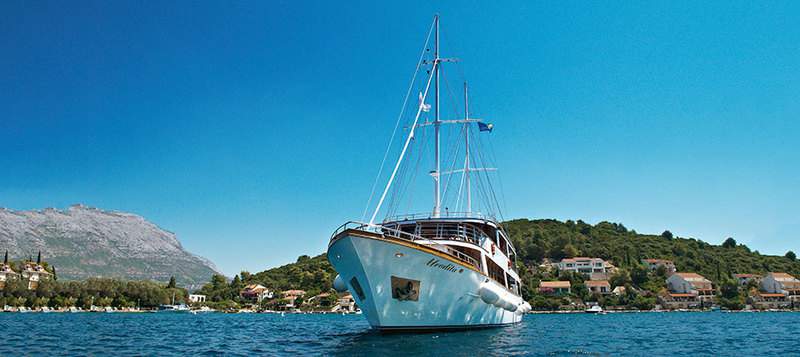M/S Afrodita is classified A+ category, 112 ft long, 25 ft wide and has 2 masts, with cruising speed of 9.5 NM. It has 17 cabins, all fully air-conditioned, with queen-size bed or twin beds with possibility for an additional bed, cupboard, cabinet and window or porthole, bathroom with shower, toilet and wash basin. It has fully air-conditioned salon-restaurant on the main deck with bar and LCD TV, two sun decks of 1,076 sq ft, one of which has sun beds and tables.