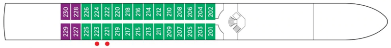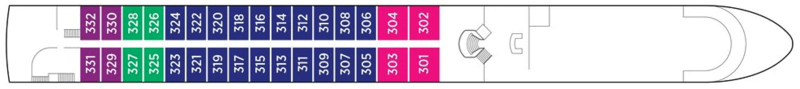 Launch year | Language | Gross tonnage | Length | Width | Currency | Capacity | Crew count | Deck count | Cabin count | Large cabin count | Wheelchair cabin count | Electrical plugs |