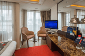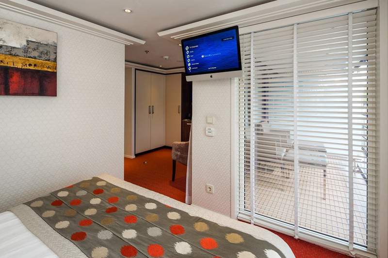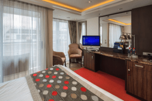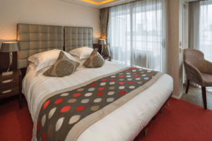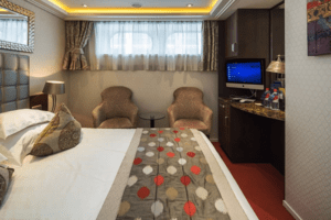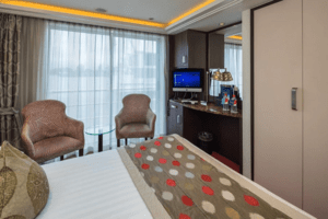 Most accommodations have twin balconies, both a French and outside balcony, so you can enjoy the ever-changing scenery however you wish. Additional stateroom amenities include Entertainment-On-Demand, featuring free high-speed Internet access, unlimited Wi-Fi, movies, music and English language TV stations; climate-controlled air conditioning; and an in-room safe. In the marble bathroom, enjoy multi-jet shower heads, soothing bath and body products, robes and hair dryers. Suites feature added enhancements, including a larger sitting area with sofa and two chairs, and an expansive bathroom complete with a bathtub and separate shower.