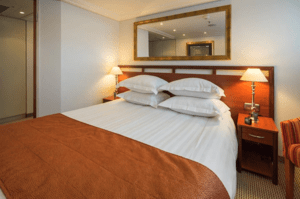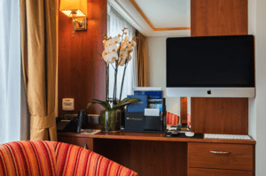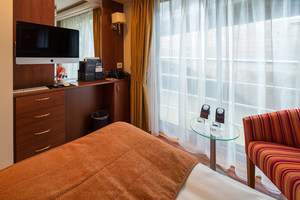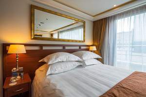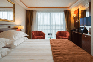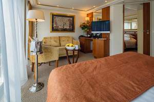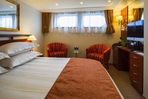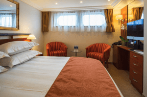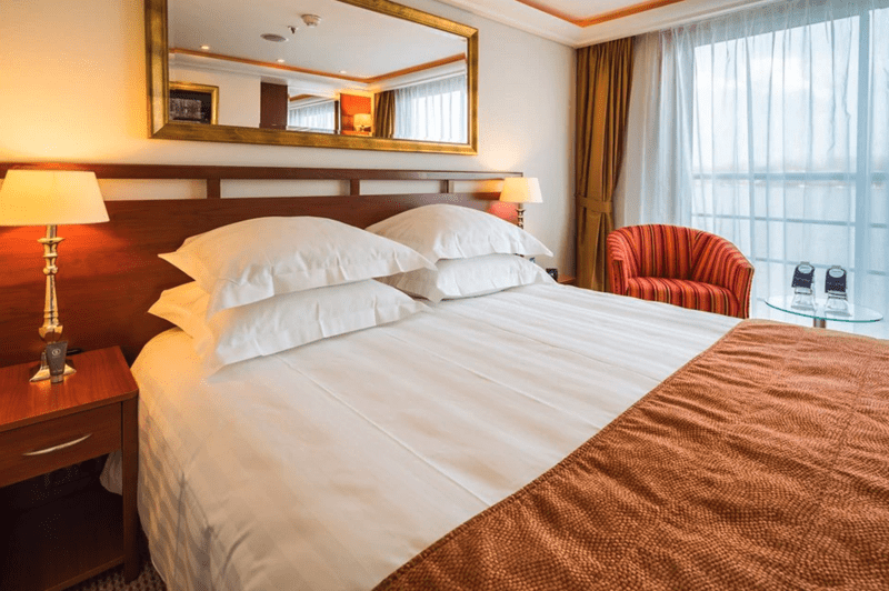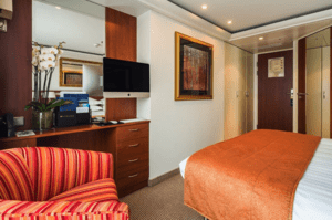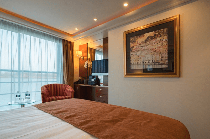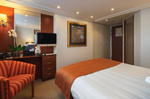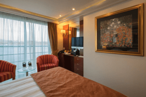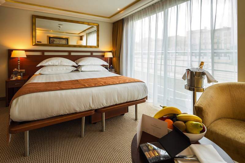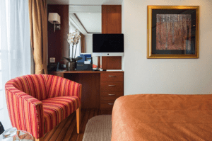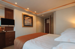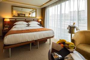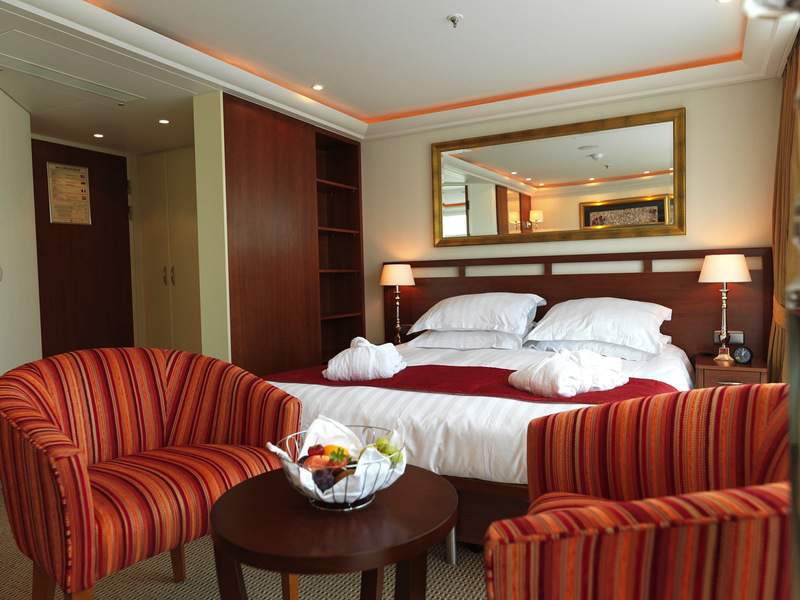 Relax in spacious, elegantly appointed staterooms, ranging in size from 170-225 sq. ft., or in a single stateroom of 140 sq. ft. You can always indulge even more in one of the suites at 255 sq. ft. Most staterooms have a French balcony. Additional stateroom amenities include Entertainment-On-Demand, featuring free high-speed Internet access, unlimited Wi-Fi, movies, music and English language TV stations; climate-controlled air conditioning; and an in-room safe. In the marble bathroom, enjoy multi-jet shower heads, soothing bath and body products, robes and hair dryers. Suites feature added enhancements, including a larger sitting area with sofa and two chairs, and an expansive bathroom complete with a bathtub and separate shower.