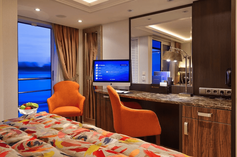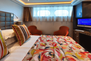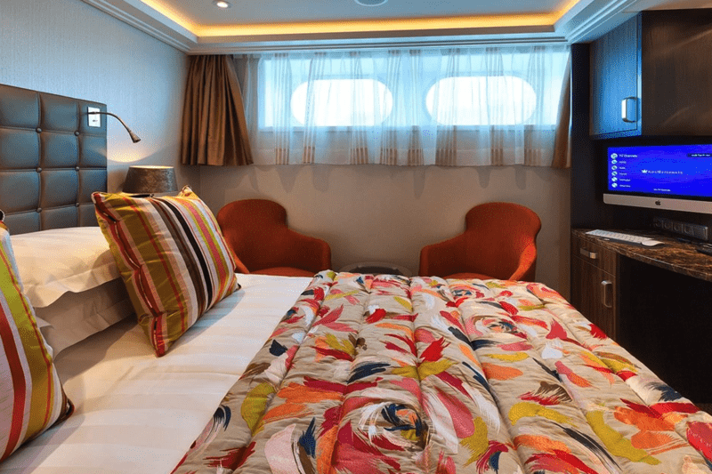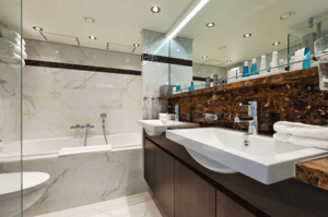 Spacious, elegantly appointed staterooms range in size from 160-290 sq. ft. or indulge even more in one of the suites at 300 sq. ft. Most accommodations have twin balconies, both a French and outside balcony, so you can enjoy the ever-changing scenery however you wish. Additional stateroom amenities include Entertainment-On-Demand, featuring free high-speed Internet access, unlimited Wi-Fi, movies, music and English language TV stations; climate-controlled air conditioning; and an in-room safe. In the marble bathroom, enjoy multi-jet shower heads, soothing bath and body products, robes and hair dryers. Suites feature added enhancements, including a larger sitting area with sofa and two chairs, and an expansive bathroom complete with a bathtub and separate shower.