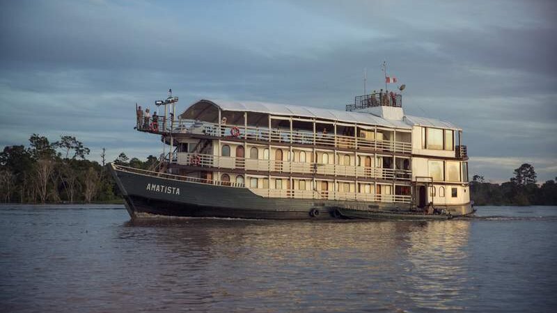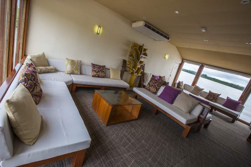 Spacious, comfortable, and well adorned – the Amatista is all of this and so much more. Share a room with a travel buddy in a gorgeous twin cabin or be the king (or queen) of your domain in a double. A/C is included in all cabins for maximum comfort while you float down the Amazon River. Lounge around while sipping coffee with your group in the communal salon, or chill out on the covered deck while watching birds soar overhead. The Amatista is equipped with a pair of skiffs for excursions, and two naturalist guides at the ready to answer your questions whenever and wherever they come up.