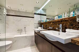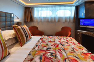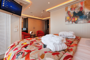 To ensure guests have the most comfortable stay possible whilst on board, all suites receive fresh bottled water daily and are also serviced daily. In selected suites a Butler service is also available. In order to make your stay onboard as comfortable as possible large wardrobes are in each suite allowing you to unpack once and relax. Each suite also has additional amenities including Entertainment-On-Demand, complimentary Wi-Fi, movies, music and English language TV stations; climate-controlled air conditioning; and an in-room safe. Each suite also has a large, spacious sitting area with a sofa and two chairs as well as a spacious bathroom complete with a hairdryer, plush bathrobes, slippers and designer toiletries.