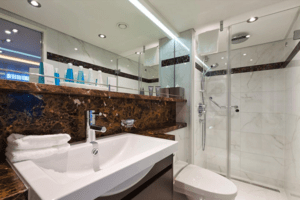 Spacious, elegantly appointed staterooms range in size from 160-290 sq. ft. or indulge even more in one of the suites at 300 sq. ft. Most accommodations have twin balconies, both a French and outside balcony, so you can enjoy the ever-changing scenery however you wish. Additional stateroom amenities include Entertainment-On-Demand, featuring free high-speed Internet access, unlimited Wi-Fi, movies, music and English language TV stations; climate-controlled air conditioning; and an in-room safe. In the marble bathroom, enjoy multi-jet showerheads, soothing bath and body products, robes and hair dryers. Suites feature added enhancements, including a larger sitting area with sofa and two chairs, and an expansive bathroom complete with a bathtub and separate shower.