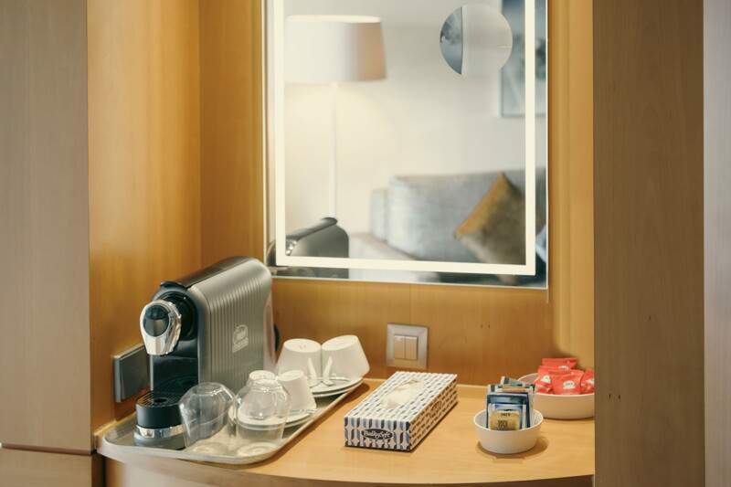 All cabins have a range of impressive amenities and personal touches. Make yourself at home with tea and coffee making facilities and take advantage of the hair dryer, personal safe, UK three pin electrical sockets and USB ports. There is also a flat screen TV for all your entertainment needs, including a range of house movies, news, documentaries, and ship information channels. So why not sit back and watch the ship position and routing from the comfort of your own cabin?