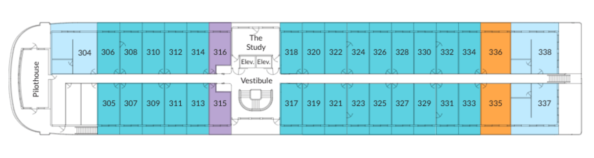 Our new suite design allows for unprecedented comfort while traveling, beginning with the new Grand Suites featuring 900 square feet of private space. These spacious suites include two glass walls and a wraparound private balcony. Complimentary room service during select mealtimes is available for every stateroom, but the Grand Suites offer ample space to host small cocktail parties or private dinner events.
