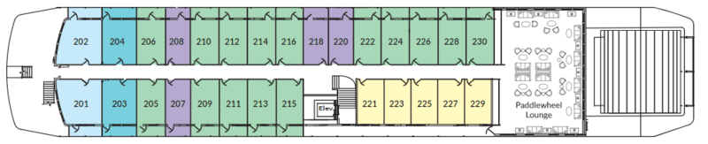 Launch year | Refit year | Language | Gross tonnage | Length | Width | Currency | Speed | Capacity | Crew count | Deck count | Cabin count | Wheelchair cabin count | Electrical plugs |