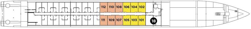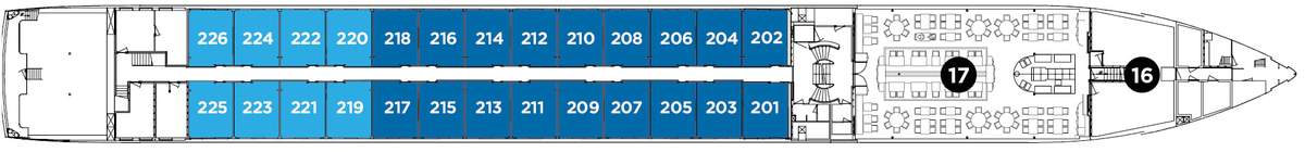 | Launch year | Language | Gross tonnage | Length | Width | Currency | Speed | Capacity | Crew count | Deck count | Cabin count | Large cabin count | Wheelchair cabin count | Electrical plugs |