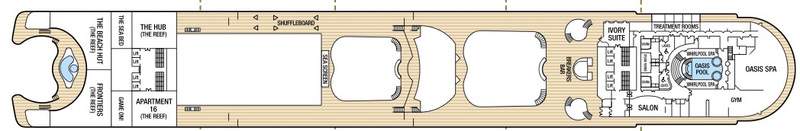 - Coral pool - Outdoor pool. 1.6 metres to 2.2 metres deep. 10.5 metres long x 4.6 metres wide. Located on Lido Deck. Has 1 ladder with 7 steps.