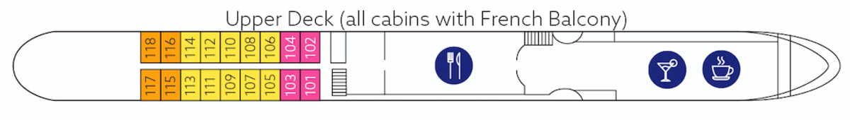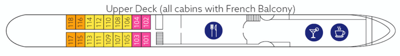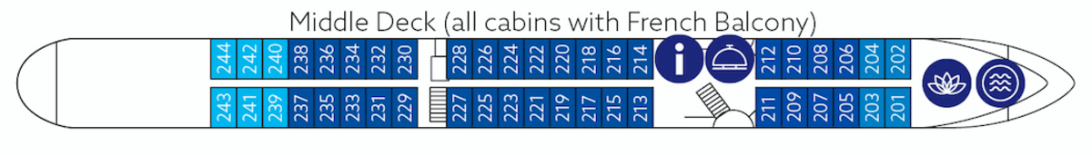 Cabins on the middle and upper deck have floor-to-ceiling panorama windows that can be opened (French balcony), the cabins on the main deck have large portholes that cannot be opened.