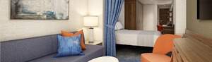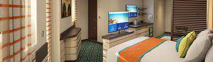 In a Havana Cabana Corner Suite you’ll find all the comforts of a normal suite... decked out in Cuba-inspired décor! Inside the room are separate living room and bedroom areas, with a TV in each, plus convenient extras like a sectional sofa and walk-in closet. Outside your amazing room lies a private lanai with your own swinging chair. (All Havana stateroom guests must be 12 or older.)