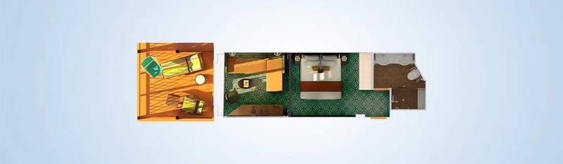 In this room you’ll find all the comfort of a suite, all decked out in Cuba-inspired décor. Outside your Havana Cabana Suite lies a luxurious lounging area with your own deck chairs and swinging chair. (All Havana stateroom guests must be 12 or older.)