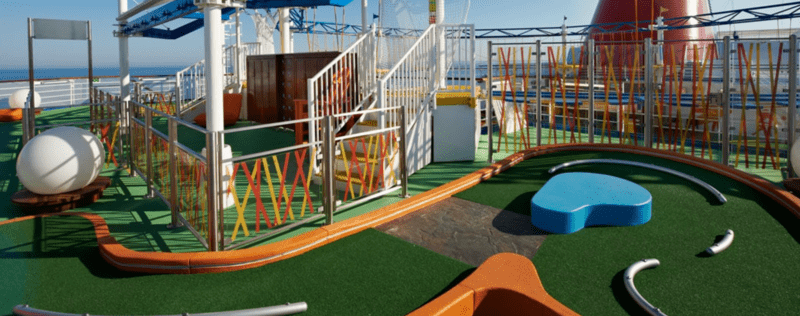 Ah, imagine a perfect day out on the links, the golfer's zen of the ball, the hole and nothing in between but well-manicured fairway... plus one cactus, a treasure chest... and wait, is that a windmill in the way? Just who designed this course anyway? Whoever it was, they had one thing in mind — maximum fun for mini-golfers, big and small! That's precisely why you'll find a course on every Carnival® ship, where you can hit the holes and take in everything you’d expect, like the sights and the sounds... plus the seagulls.