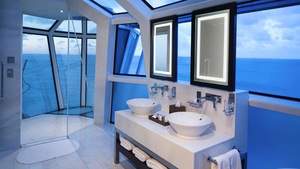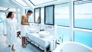 Available only on Celebrity Reflection®, our Reflection suites have extra-high ceilings and full-height glass doors and windows that display spectacular views; not only from the spacious sitting area but also from the bathroom—which awakens you with a cantilevered glass shower jutting over the sea.