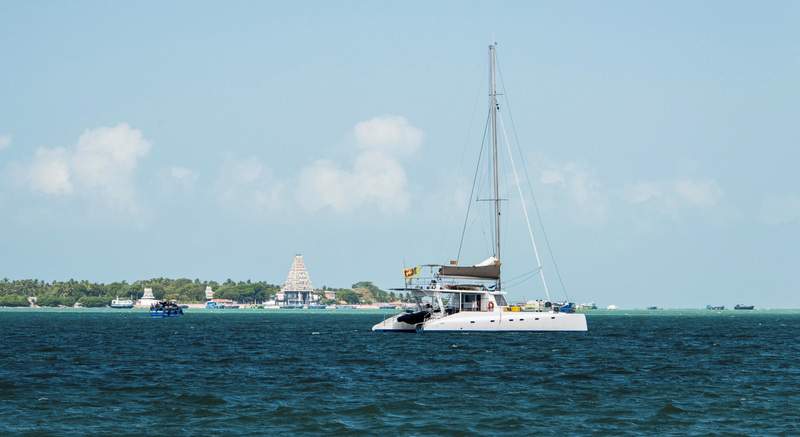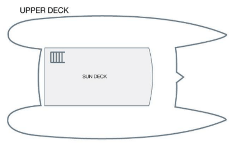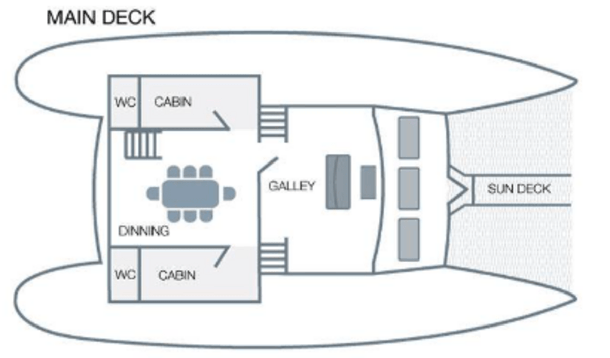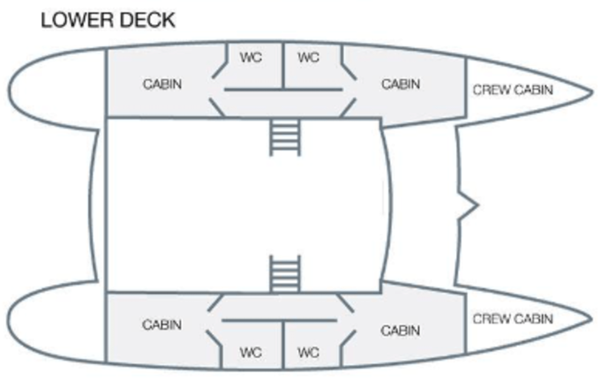 Our 16m (53 ft) sailing catamaran is equipped with four double/twin cabins in the Lower Deck, with en suite bathrooms, portholes, and rooftop pop-up skylights. The 12-passenger boat has an additional two bunk bed cabins on the Main Deck, with en suite bathrooms and a window. There is an on-board covered area for dining, an upper sun deck, and forward netting for relaxing.