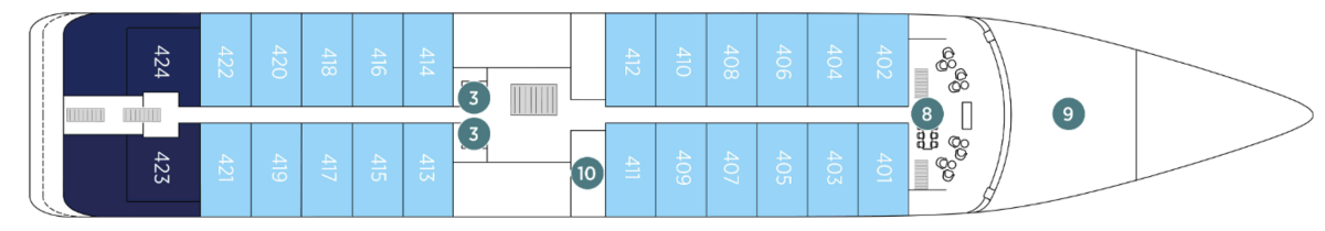An abundance of space on board, combined with a maximum guest number of 100 and a crew of 64, allows us to provide an excellent level of personal service throughout your holiday.