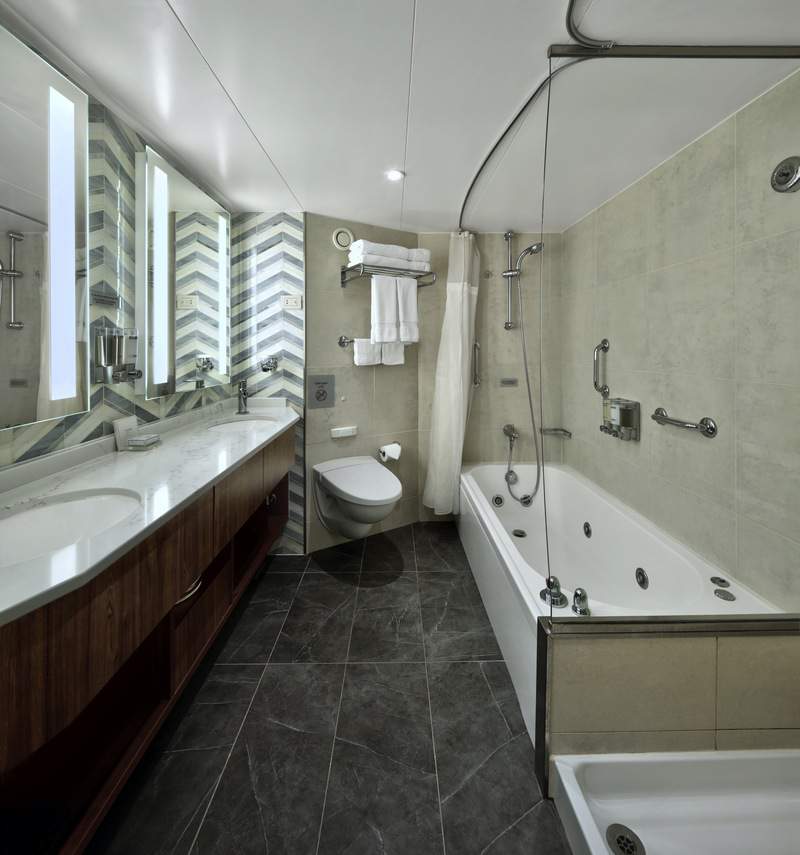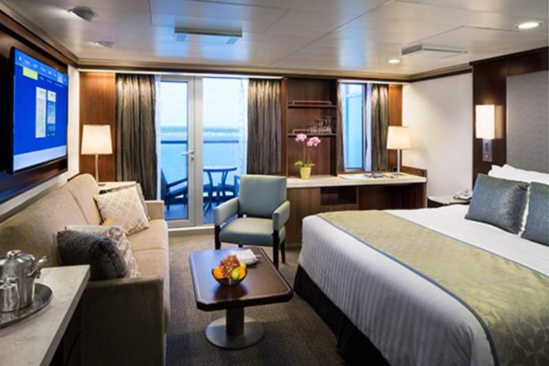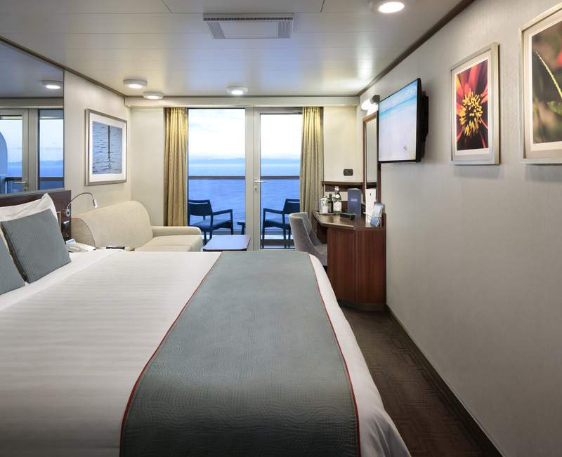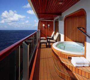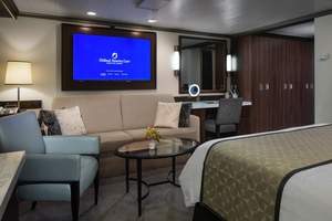 Filled with light from floor-to-ceiling windows overlooking a private verandah, these staterooms include a sitting area, two lower beds convertible to one queen-size bed—our signature Mariner's Dream™ bed with plush Euro-Top mattresses, and bath tub with premium massage showerheads.