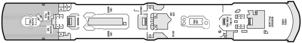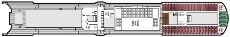 The Lido Pool is also located midship on deck 9. It has 3 hot tubs and is protected by a retractable glass dome cover during inclement weather. It is served by the Lido Bar and Trident Grill for light meals and has a bandstand for live entertainment.