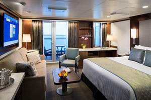 With floor-to-ceiling windows overlooking a private verandah, these spacious suites are flooded with light. They feature a large sitting area with a mini-bar and refrigerator, and two lower beds convertible to one king-size bed—our signature Mariner's Dream™ bed with plush Euro-Top mattresses plus a separate dressing room. There's also a sofa bed, suitable for two people. The bathroom comes with a dual-sink vanity, full-size whirlpool bath and shower, plus additional shower stall. Amenities include use of the exclusive Neptune Lounge, a private concierge and an array of complimentary services.