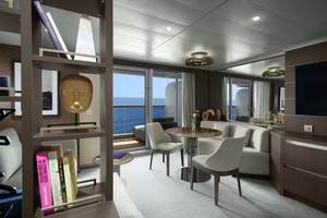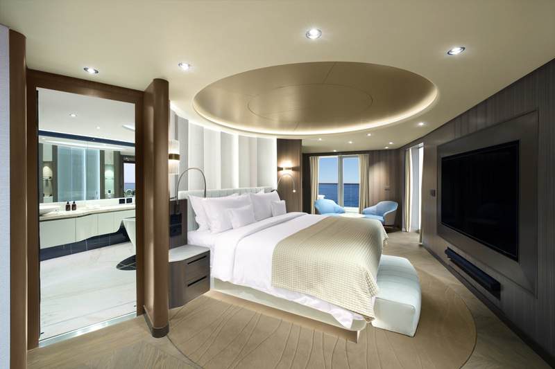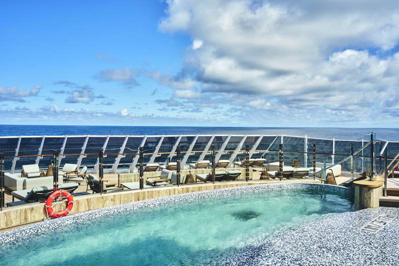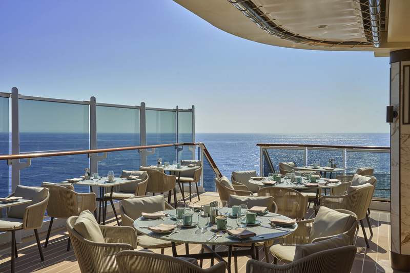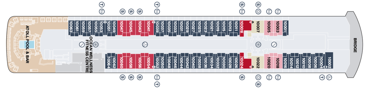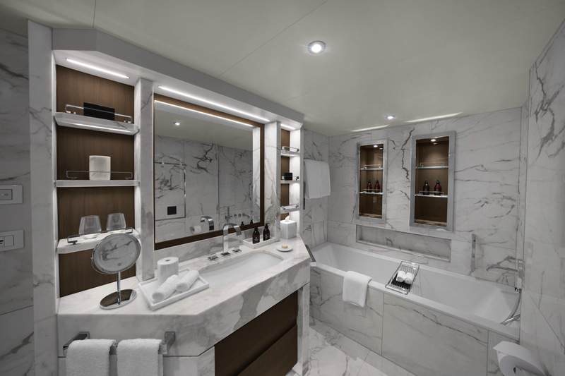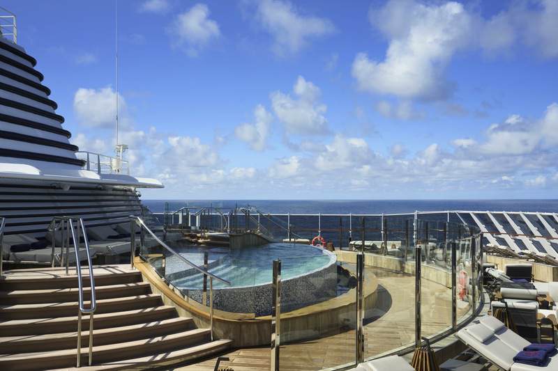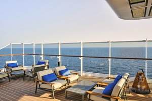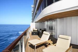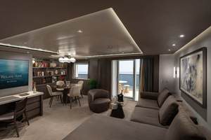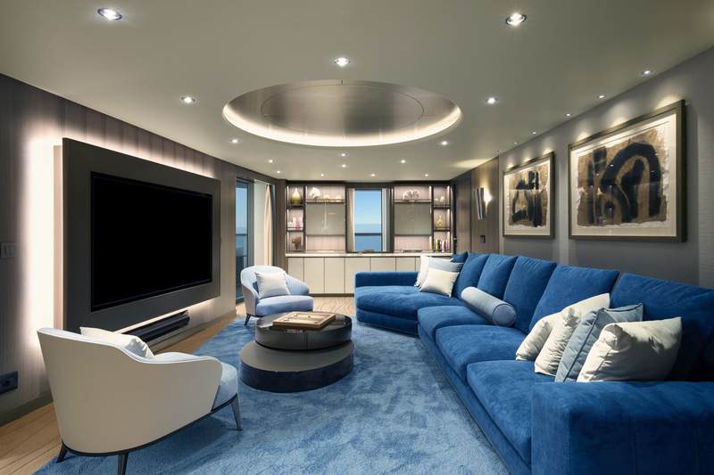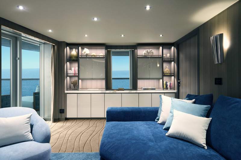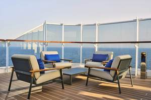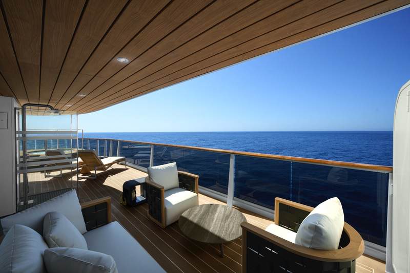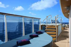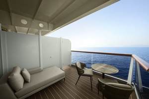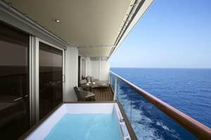 - Panoramic ocean-front terrace covering the full ship’s width, with a private outdoor spacious whirlpool, day beds, a dining table, lounge area, shower and sun loungers