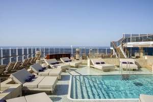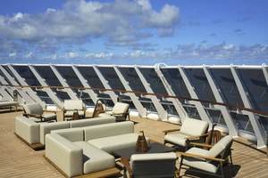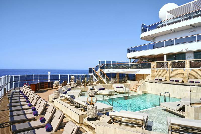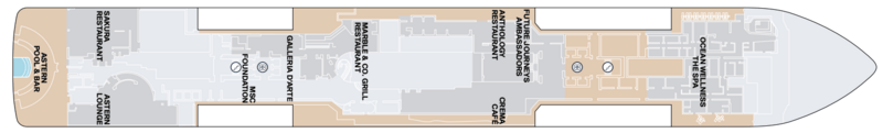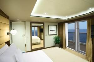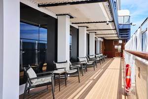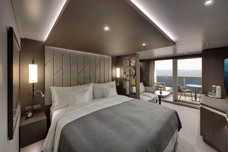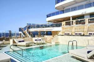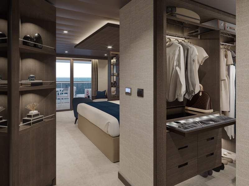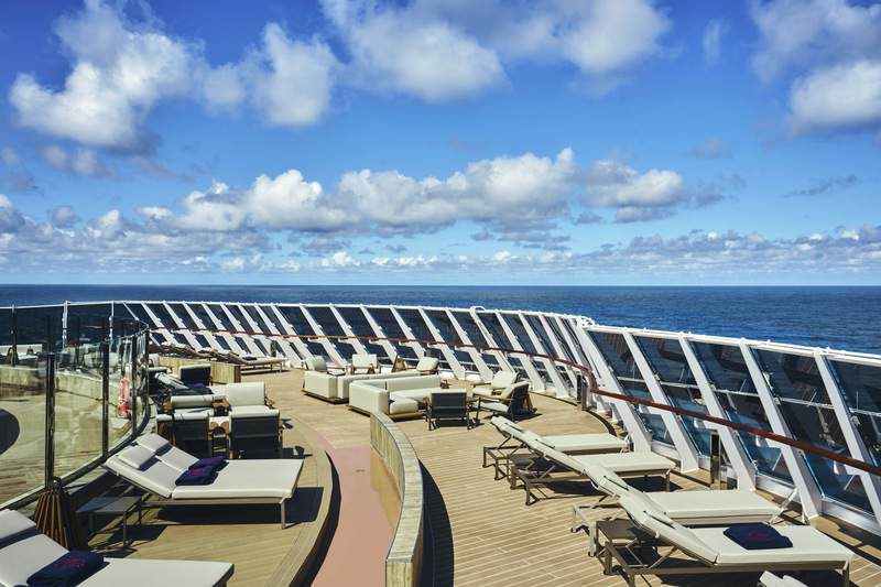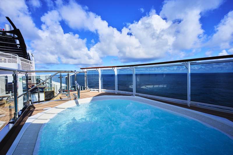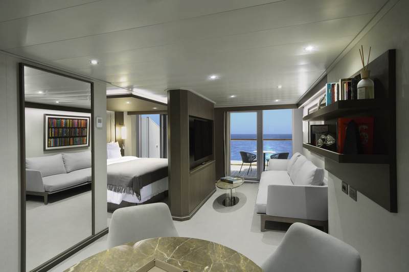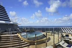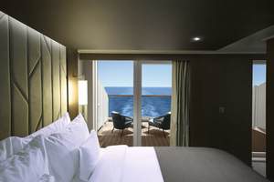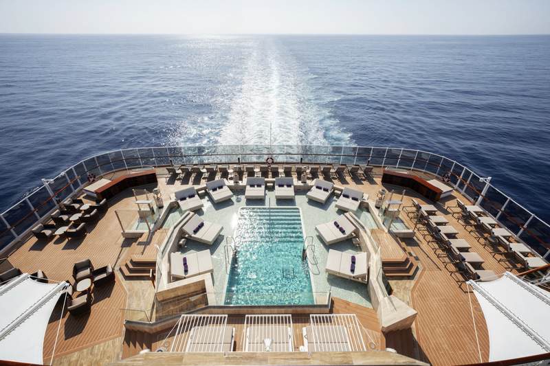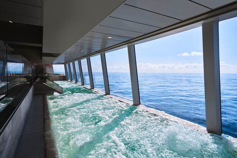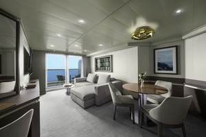 - Panoramic ocean-front terrace covering the full ship’s width, with a private outdoor spacious whirlpool, day beds, a dining table, lounge area, shower and sun loungers