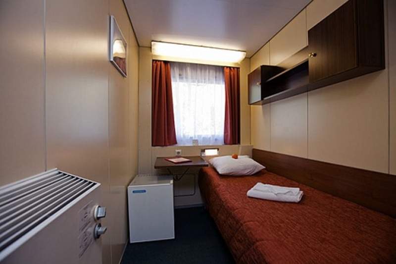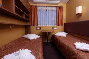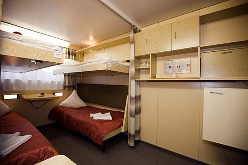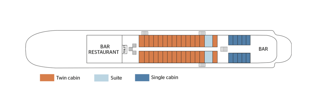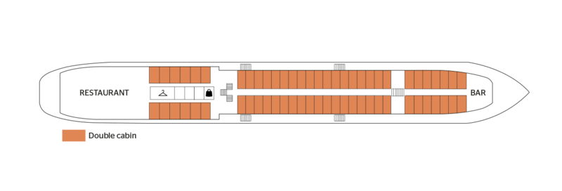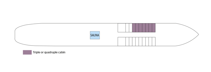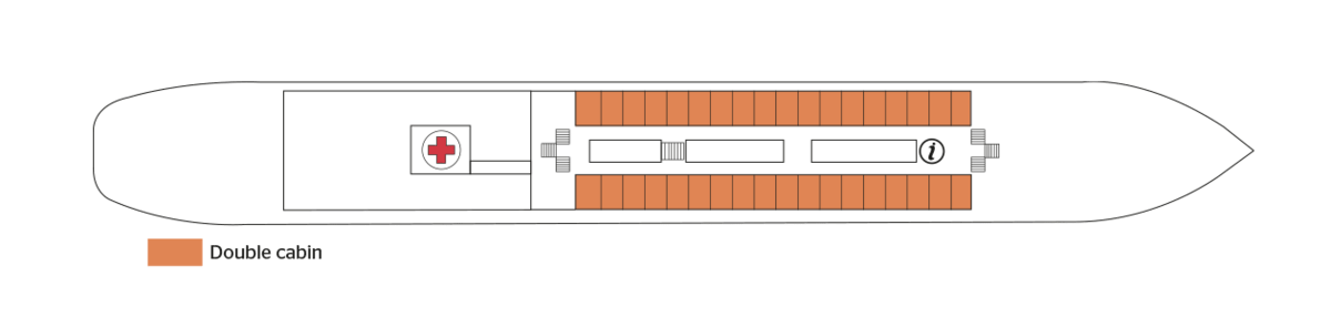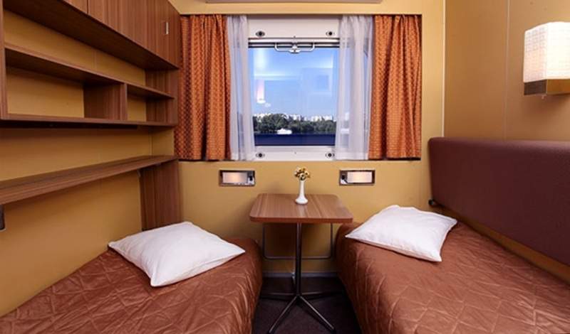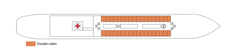 All cabins face the water (approx. 96 sq. ft.) and have low berths, private bathroom with shower, air conditioning, radio, picture window (except Lower Deck cabins: 2 portholes per cabin).