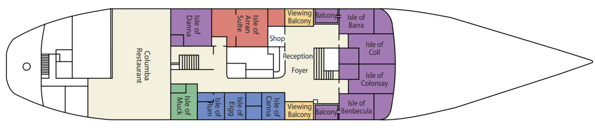 Hebridean Princess has five stunning decks, each offering something unique. The Boat Deck is where all the best views can be seen, with plenty of space to relax and soak up the scenery. The Promenade Deck holds most of the public rooms, such as the Lounge, Library and Conservatory. As well as extra space to enjoy the open air on the Skye Deck at the rear. The welcoming reception foyer and elegant fine-dining restaurant are on the Princess Deck. While the luxury cabins are located across several of the decks.