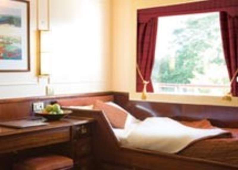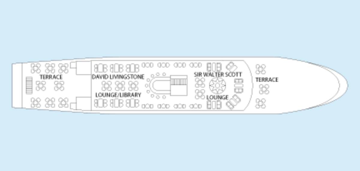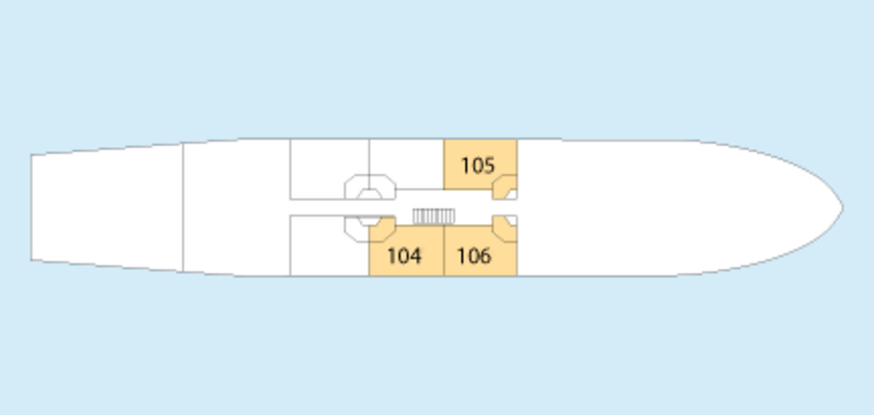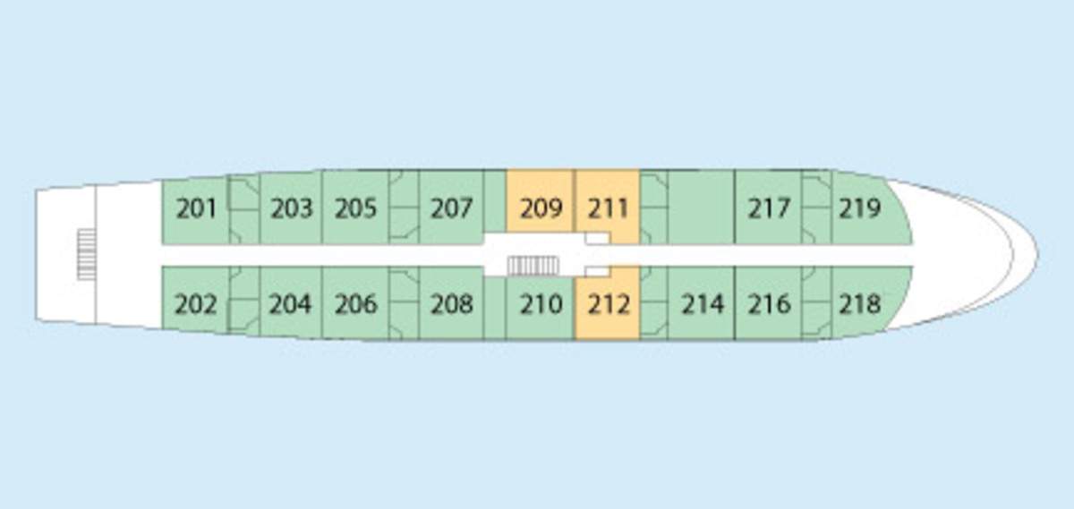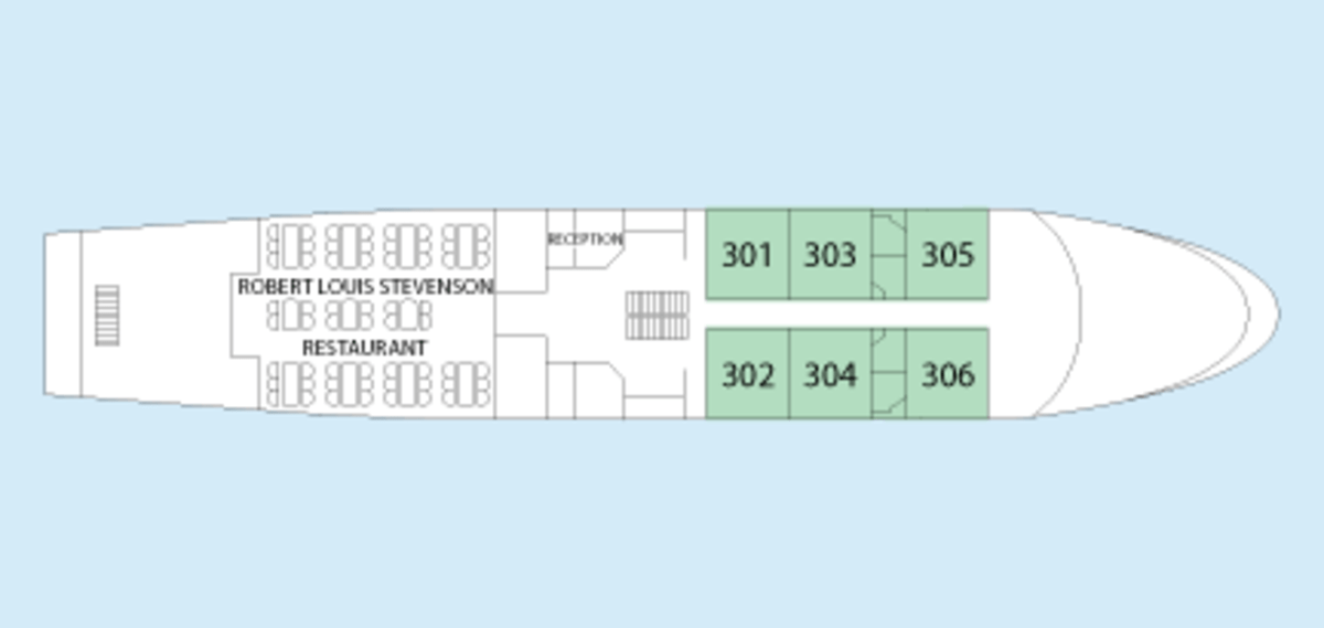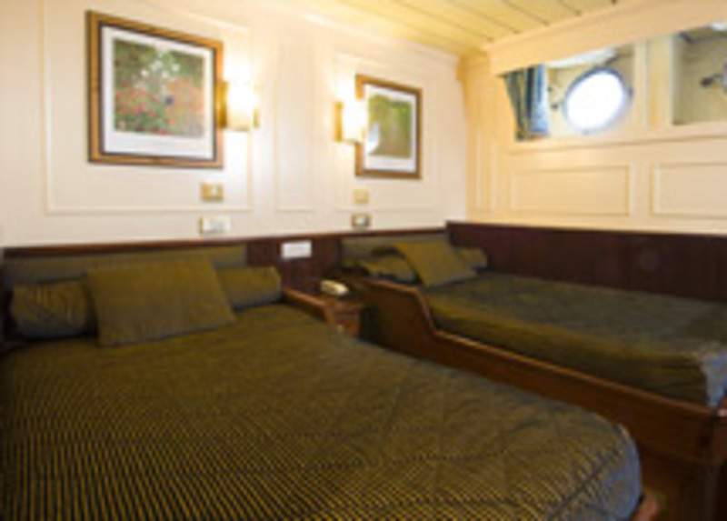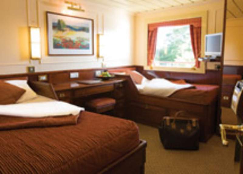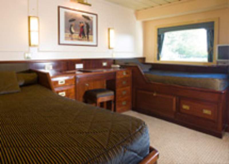There are 27 deluxe State-cabins accommodating 54 passengers each tastefully furnished in mahogany finishes, with dressing table and stool, hairdryer, satellite TV, individually controlled air-conditioning/heating, safe deposit box, music system, internal telephone and en-suite facilities (shower, toilet, and washbasin). Cabin wall lighting is from the SS France. In addition to the storage for suitcases under the beds there is a full size wardrobe.