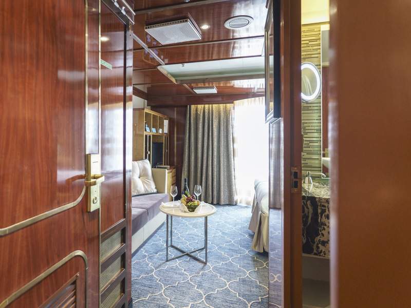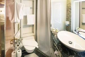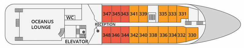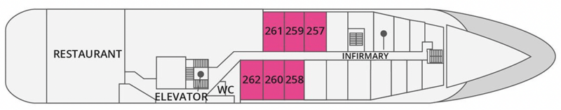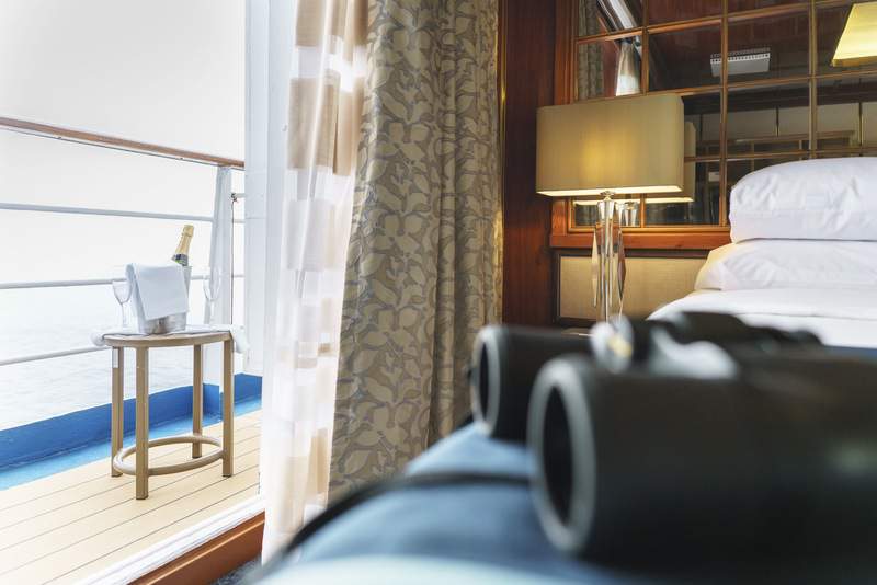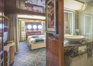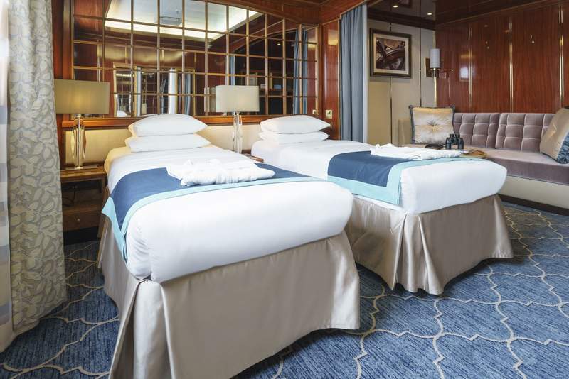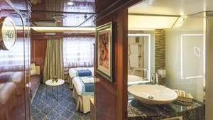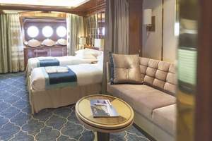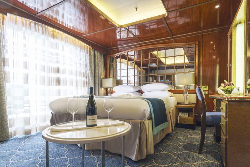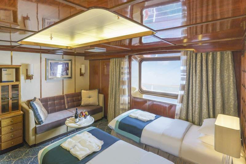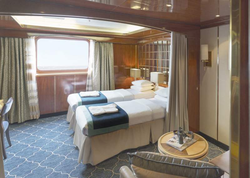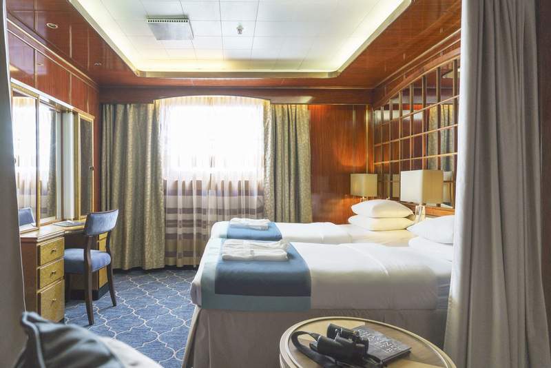 Averaging 21 square meters/226 square feet, these cabins are located on the Oceanus Deck. They feature a picture window (it may be covered during rough sea crossings), two wardrobes, and a King Size bed. Amenities include: en suite facilities, in-room safe, refrigerator, satellite telephone access, TV/VCR, individual temperature control, and hair dryer.