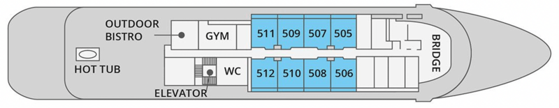 Public areas include: Reception, Restaurant, Bar, Outdoor Bistro, Club Lounge, Library, Presentation Lounge, Infirmary, Gym, Bridge.