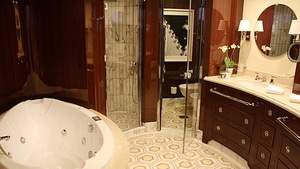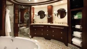 Given their lavish interior design that resembles an elegant and luxurious Park Avenue home along with their premier location overlooking the bow of the ship, the eight Vista Suites are in high demand. These 1,200- to 1,500-square-foot suites include access to the exclusive Executive Lounge as well as every imaginable amenity, such as a large walk-in closet, king-size bed, second bathroom for guests, indoor and outdoor whirlpool spas and your own private fitness room.