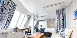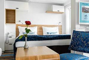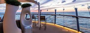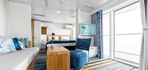 The premium Verandakabinen have a 30 sqm veranda with hammock, table, 2 chairs each and chairs - here you can enjoy the fantastic sea view to the fullest. The suites offer on the decks 7-11 of the Mein Schiff 5 with approx. 17 square meters of living space an overwhelming feeling of space. The Premium Verandakabinen can be booked with a maximum of 3 persons (2 beds and bedcouch). If desired, they can be assembled or disassembled.