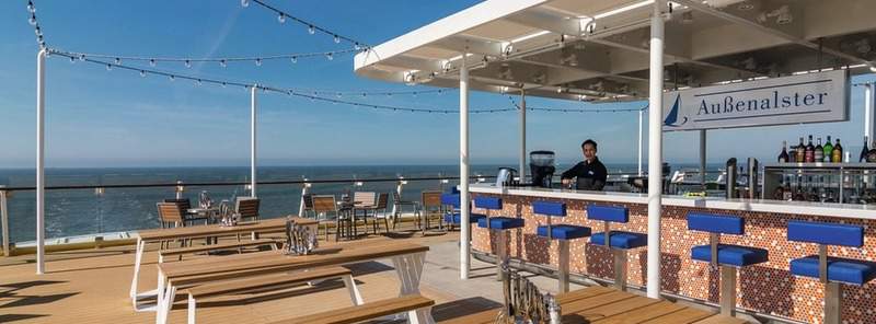 At the stern of Mein Schiff 6 on deck 14 you will find the relaxed Außenalster - Bar & Grill. Decide for yourself whether it is still bar or bistro and enjoy the breathtaking panoramic view of the sea. Here you have the opportunity to enjoy a drink and to order a snack from the grill, a crisp salad or delicious tapas.