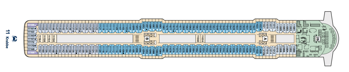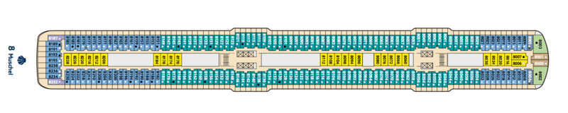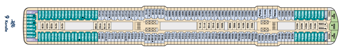 On Decks 3 and 6-11 are the modern inner cabins of Mein Schiff 6. The large cabins offer you with 17 square meters of living space just as much space as the balcony or outer cabin . They can be booked with a maximum of 4 persons. The arrangement of the beds is variable ( 2 beds and up to 1 bedcouch or 1 double bedcouch or 1 pullman bed). If desired, these can be combined or disassembled. See the deck layout for details.