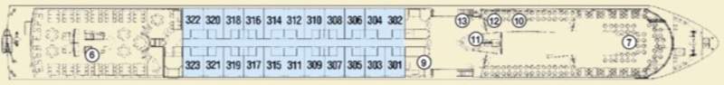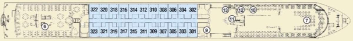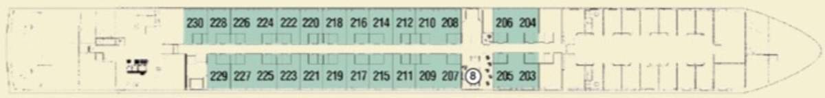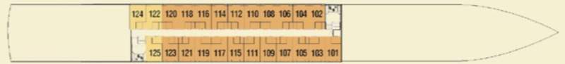 Launch year | Refit year | Language | Gross tonnage | Length | Width | Currency | Speed | Capacity | Crew count | Deck count | Cabin count | Large cabin count | Wheelchair cabin count | Electrical plugs |