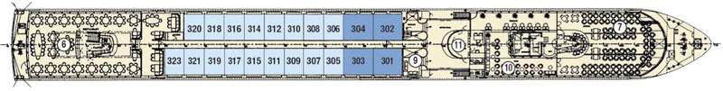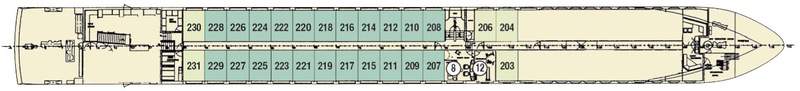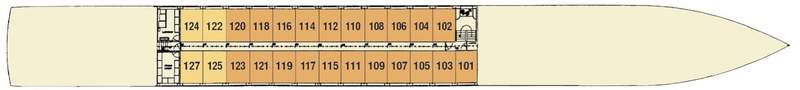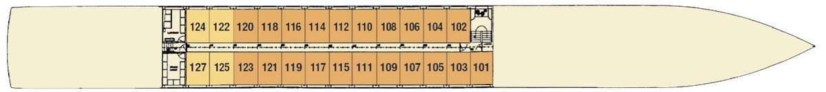 Launch year | Refit year | Language | Gross tonnage | Length | Width | Currency | Speed | Capacity | Crew count | Deck count | Cabin count | Large cabin count | Wheelchair cabin count | Electrical plugs |
