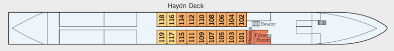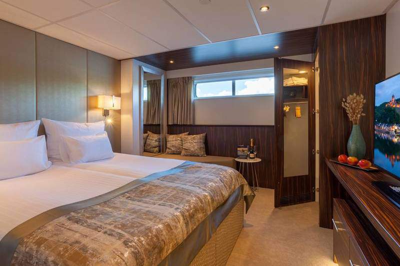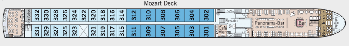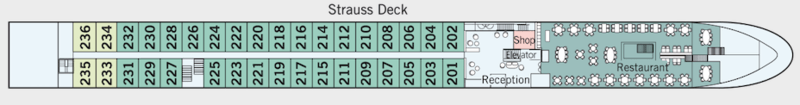 The ship offers 72 spacious deluxe cabins (17.5m2 / 188 sq.ft.) and 12 AMADEUS suites (26.4m² / 284 sq.ft.) in total. As on all ships built since 2011, the AMADEUS Imperial cabins on the Mozart and Strauss decks also feature lowerable panoramic windows along the entire cabin width. All deluxe cabins and suites are equipped with comfortable, spacious bathrooms, an infotainment system, a flat screen television, a telephone, a cabin safe, a minibar and individually adjustable air conditioning. The suites also have an accessible outdoor balcony with a seating area.