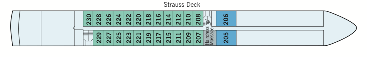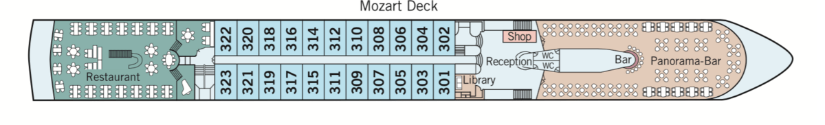 Launch year | Refit year | Language | Gross tonnage | Length | Width | Currency | Speed | Capacity | Crew count | Deck count | Cabin count | Large cabin count | Wheelchair cabin count | Electrical plugs |