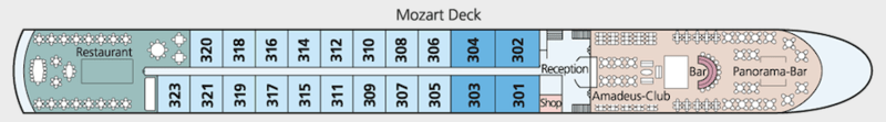 Our long-standing company not only manages its own ships, but is also responsible for the planning and building of the ships, which are consequently conceived from the start with a perfect mix of modern elegance and luxurious comfort. This is particularly evident in the public spaces such as the airy Panorama Restaurant, the generous and inviting bar and the pleasant, relaxing Amadeus Club with its library.