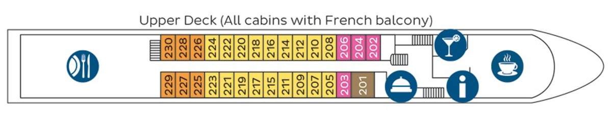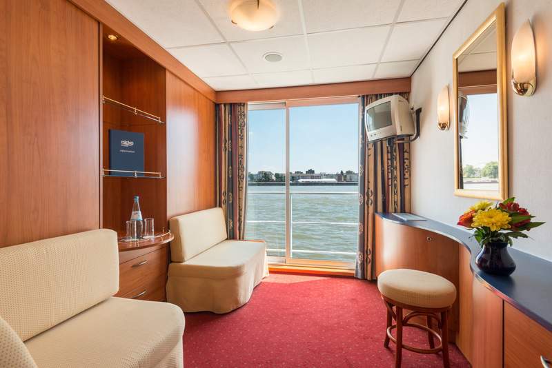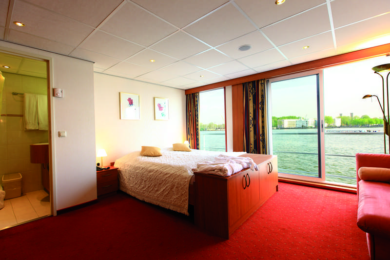 The cabins are 2 bed outer cabins, furnished identically on both sides and have an approximate size of 24m². All cabins are equipped with an air conditioning system that can be regulated separately, shower/WC, hair dryer, SAT TV, safe and telephone. The cabins on the upper deck are equipped with floor to ceiling panorama windows that can be opened (French balcony). The windows in the cabins on the main deck cannot be opened. The 2 bed premium cabins are furnished with a double bed with two mattresses and a sofa.