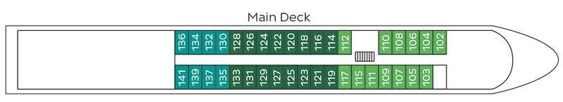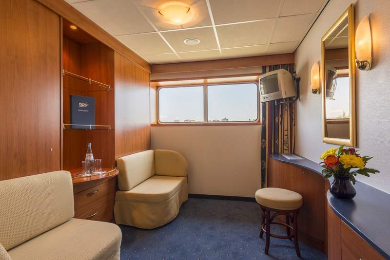 The cabins are 2 bed outer cabins, furnished identically on both sides and have an approximate size of 13m². All cabins are equipped with an air conditioning system that can be regulated separately, shower/WC, hair dryer, SAT TV, safe and telephone. The cabins on the upper deck are equipped with floor to ceiling panorama windows that can be opened (French balcony). The windows in the cabins on the main deck cannot be opened. Each cabin is located with two separate wall-mounted foldaway beds that will be prepared for the sleeping for the guests by the ships crew. During the daytime, the cabins have two small sofas.