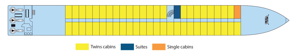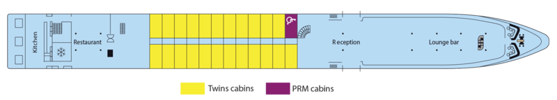 | Launch year | Refit year | Language | Length | Width | Currency | Speed | Capacity | Crew count | Deck count | Cabin count | Large cabin count | Wheelchair cabin count | Electrical plugs |