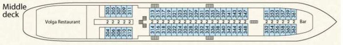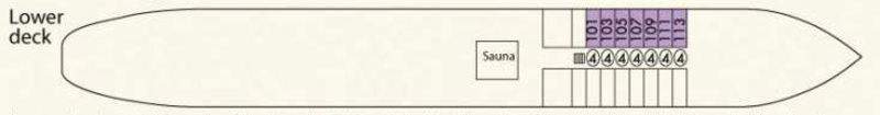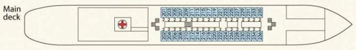 All cabins are equipped with en-suite facilities, wardrobe, radio, refrigerator and air conditioning. They each also have a large scenic opening window, except for the lower deck.