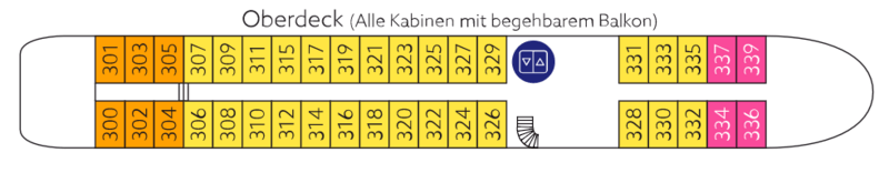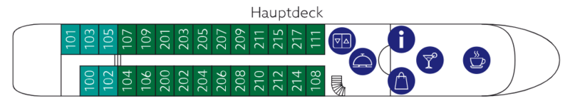 The main deck is where you will find the passenger’s reception desk, the cruise director’s office, the lounge, the gift shop and the panorama salon with bar, offering live music in the evenings, or a comfortable spot to indulge in a good book.