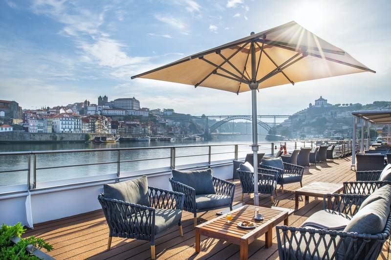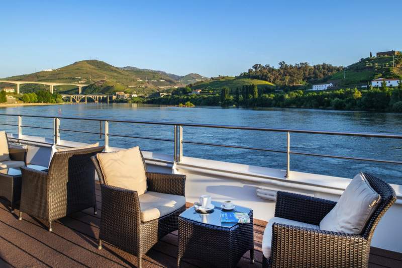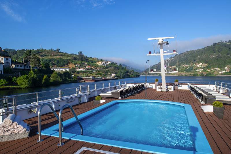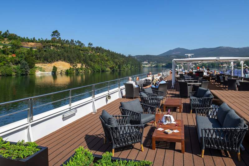 Taking advantage of the warm Portuguese weather, MS Douro Queen’s sun deck runs the length of the ship, offering a swimming pool for a refreshing dip, comfortable loungers for relaxation, as well as tables and chairs for socialising. Those seeking a little shade will appreciate the covered seating area, ensuring everyone has somewhere comfortable to enjoy the panoramic views of the Douro Valley’s picturesque terraces.