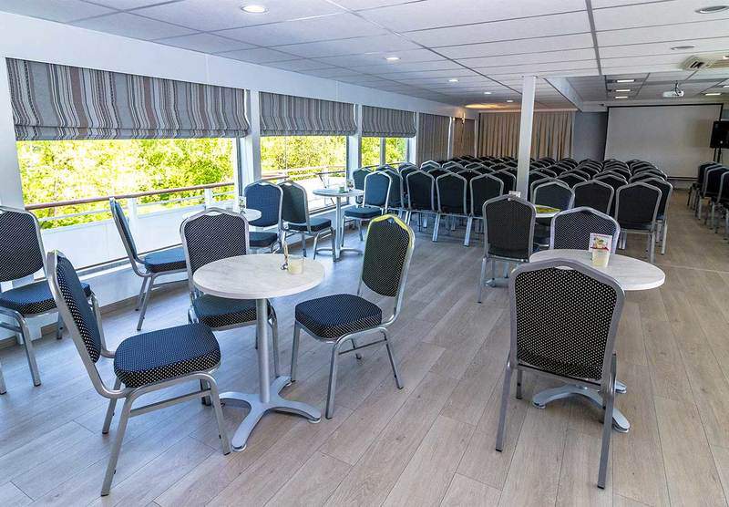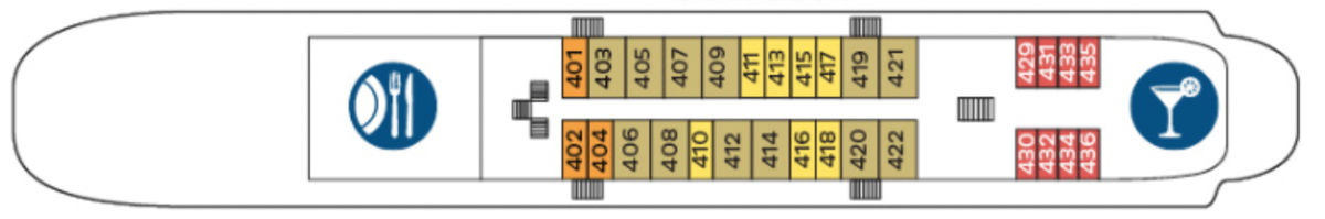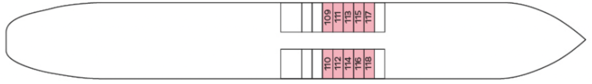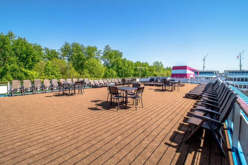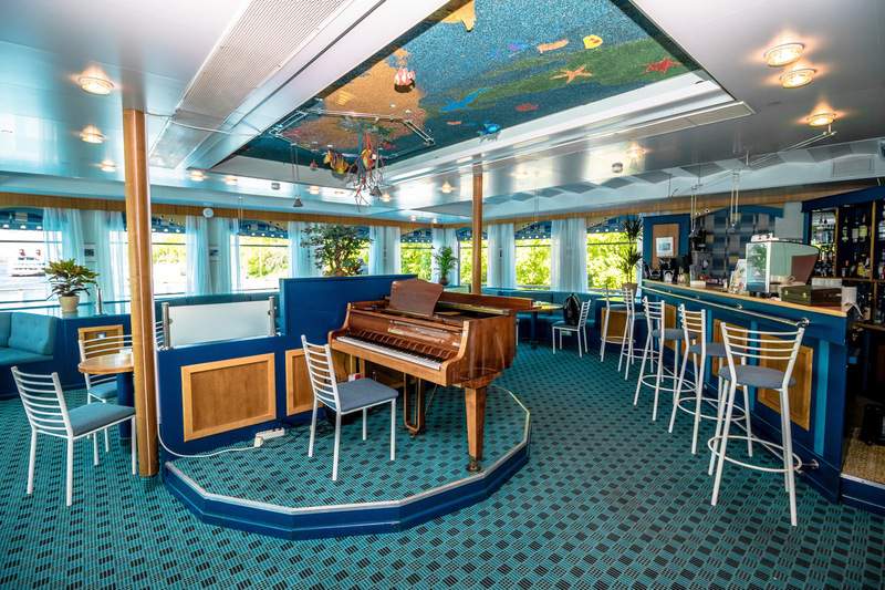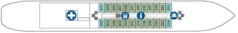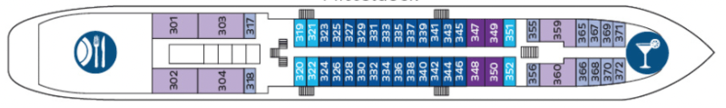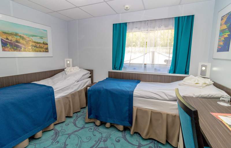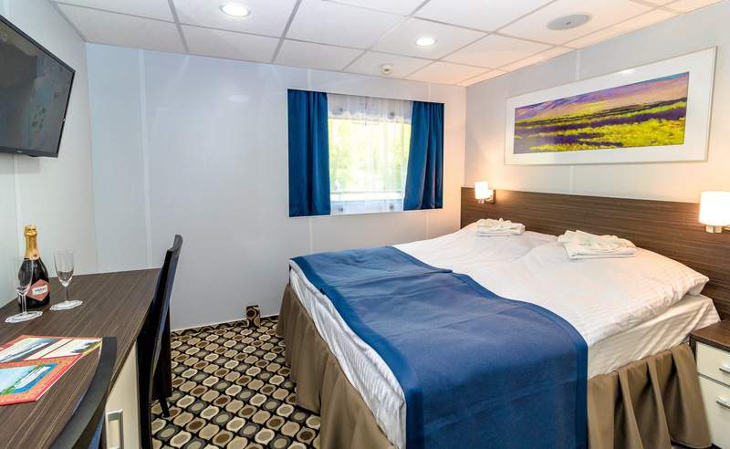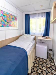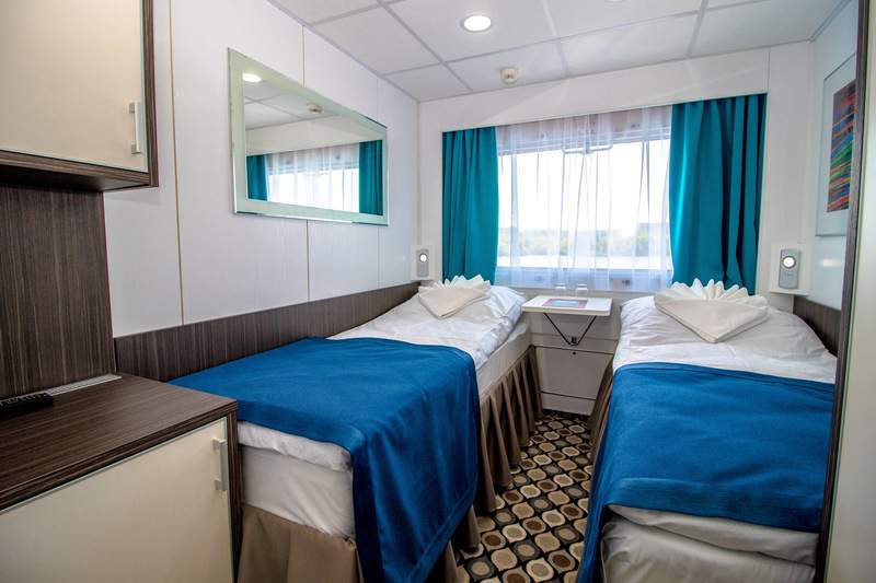 All cabins are outside cabins and have large, openable panoramic windows (lower deck: non-opening portholes). The double cabins front/aft are approx. 9 m² in size; standard cabins are approx. 10 m² and each have two single beds, as do the deluxe cabins on the main deck (approx. 13.5 m²). The deluxe cabins on the upper deck (approx. 15.5 m²) have double beds, which can also be separated. All 2 bed cabins have a bathroom (shower/WC) with hairdryer, individually adjustable air conditioning/heating, a mini fridge, built-in closet, on-board radio, safe and TV. The suites (approx. 28 m²) also have a separate living and sleeping area with a king size bed (double bed with a continuous mattress). The 1 bed cabins are approx. 7 m² in size and have a shower room with hairdryer.