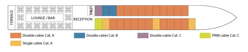 | Launch year | Refit year | Language | Gross tonnage | Length | Width | Currency | Speed | Capacity | Crew count | Deck count | Cabin count | Large cabin count | Wheelchair cabin count | Electrical plugs |