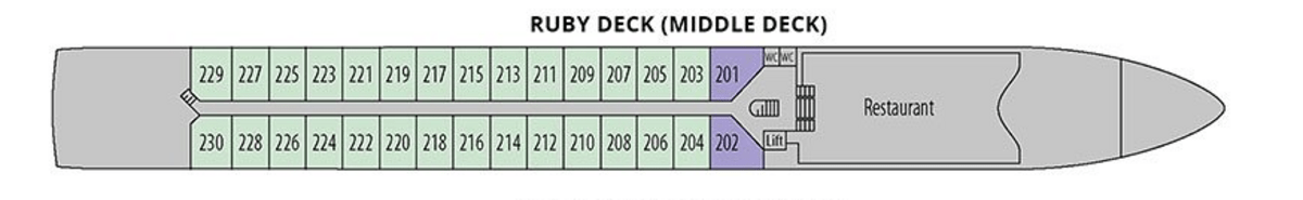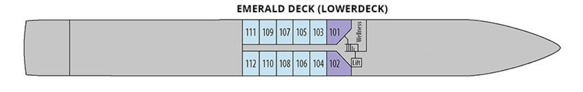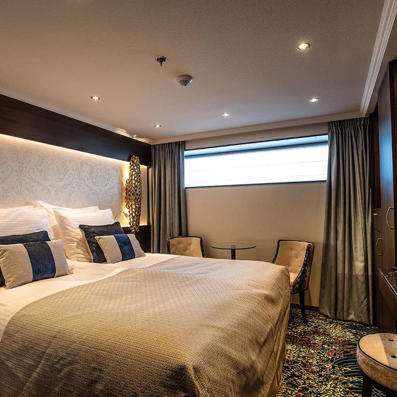 There are 70 luxuriously appointed suites and cabins, which all feature an en-suite bathroom with shower, individually controlled air-conditioning, flat-screen TV, hairdryer, safe, minibar, telephone and facilities for making tea and coffee. Complimentary Wi-Fi is available throughout the ship.