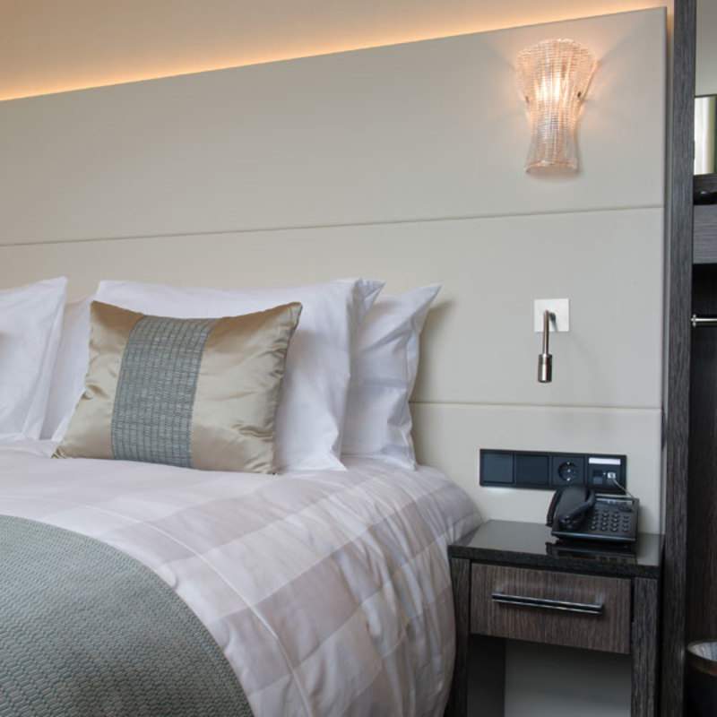 Padded headboard with reading lamps, Walk-in closet with built-in shelves, Pull-out sleeping sofa 190 cm x 110 cm – 75" x 43" (triple & quad capacity; quads for children only), Storage / drawers, 400 thread count cotton linens / white duvets and pillows of mako cotton with 90% down filling