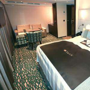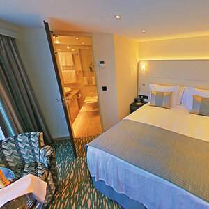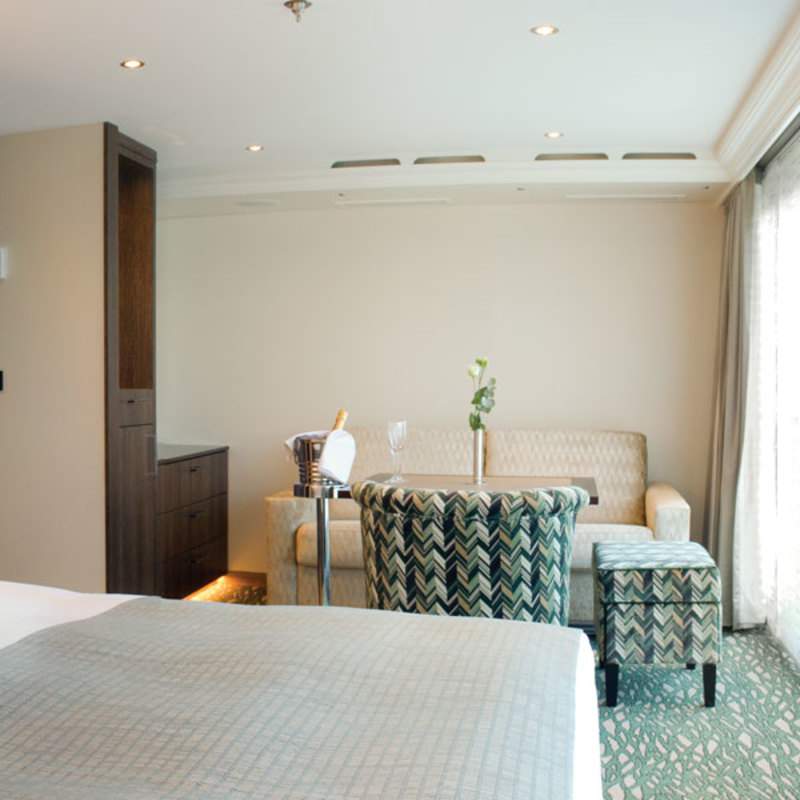 Two floor-to-ceiling French balconies, each 98 inches x 75 inches with one sliding door that opens, 32" LED TV, Safe, Minibar stocked with complimentary water and soft drinks, replenished daily, Coffee maker, Breakfast room service, Iron plus ironing board, 220v and 110v outlets in cabin and bathroom, Easy under-bed luggage storage, Telephone and individual climate control, Onboard wi-fi available, a shipboard credit (one per stateroom) is provided to be used onboard for spa services, gift shop purchases, etc